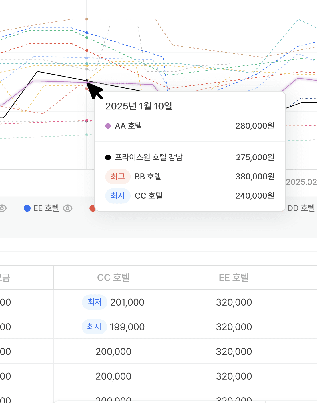 실시간으로 경쟁사의 요금 변동을 추적하여 시장 내 경쟁력 있는 가격 전략을 수립할 수 있습니다.